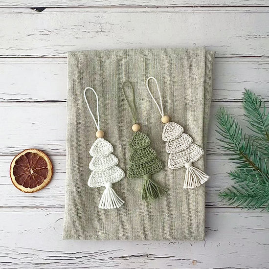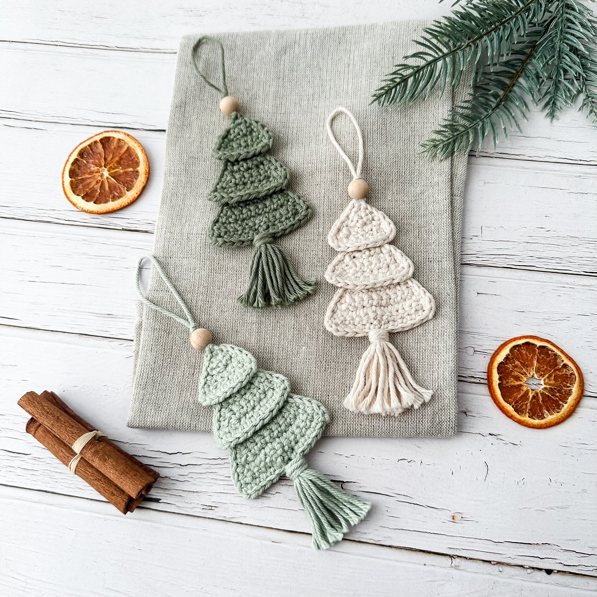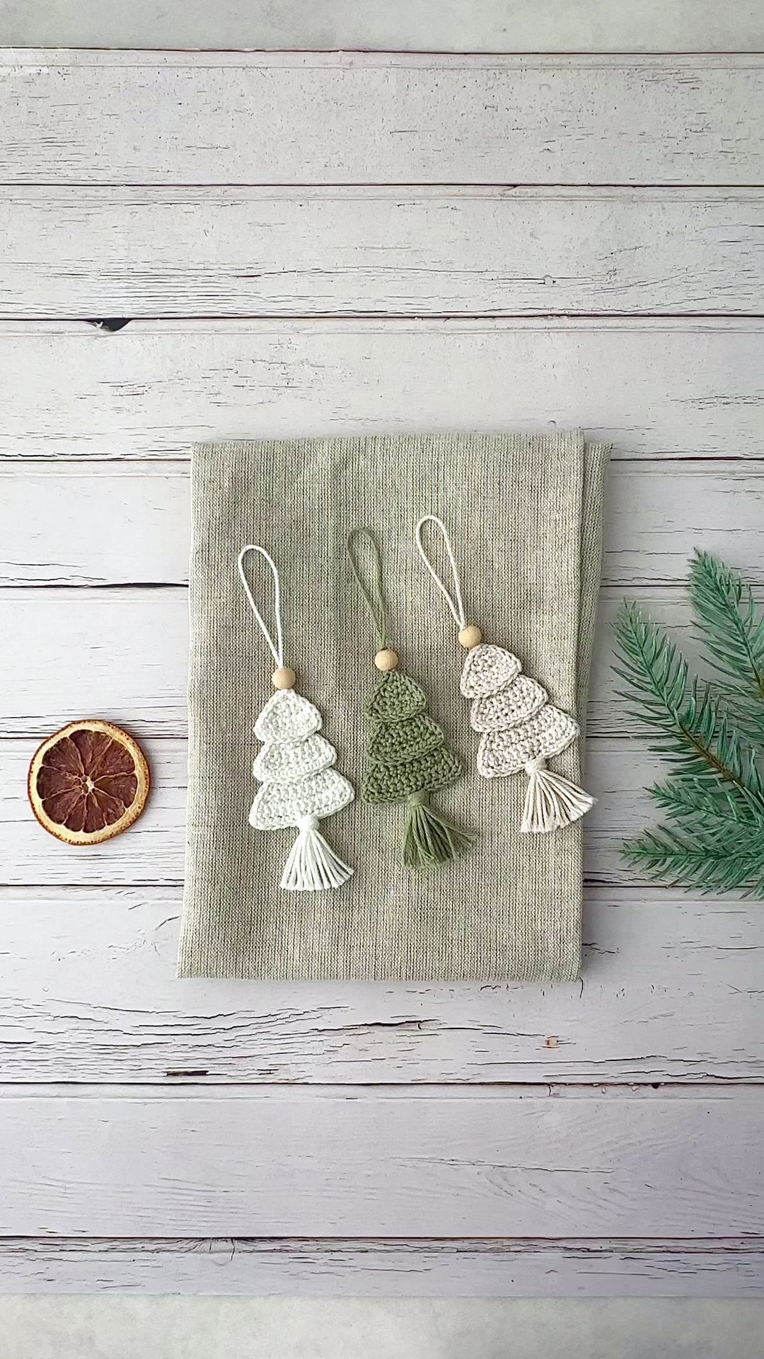 ♡ Crochet beautiful and simple Christmas tree ornaments! Decorate your Christmas tree, gift wrapping, table setting, windows- or why not hang them on a bottle? Or use them as car charms, bag charms or as keychains! You can also turn them into a lovely garland and add a string of lights for extra sparkle. The only limit is your imagination!